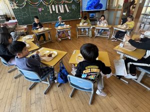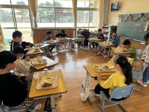 各学年で給食の配膳を済ませ、わかめ班の場所へ移動して給食を食べました。